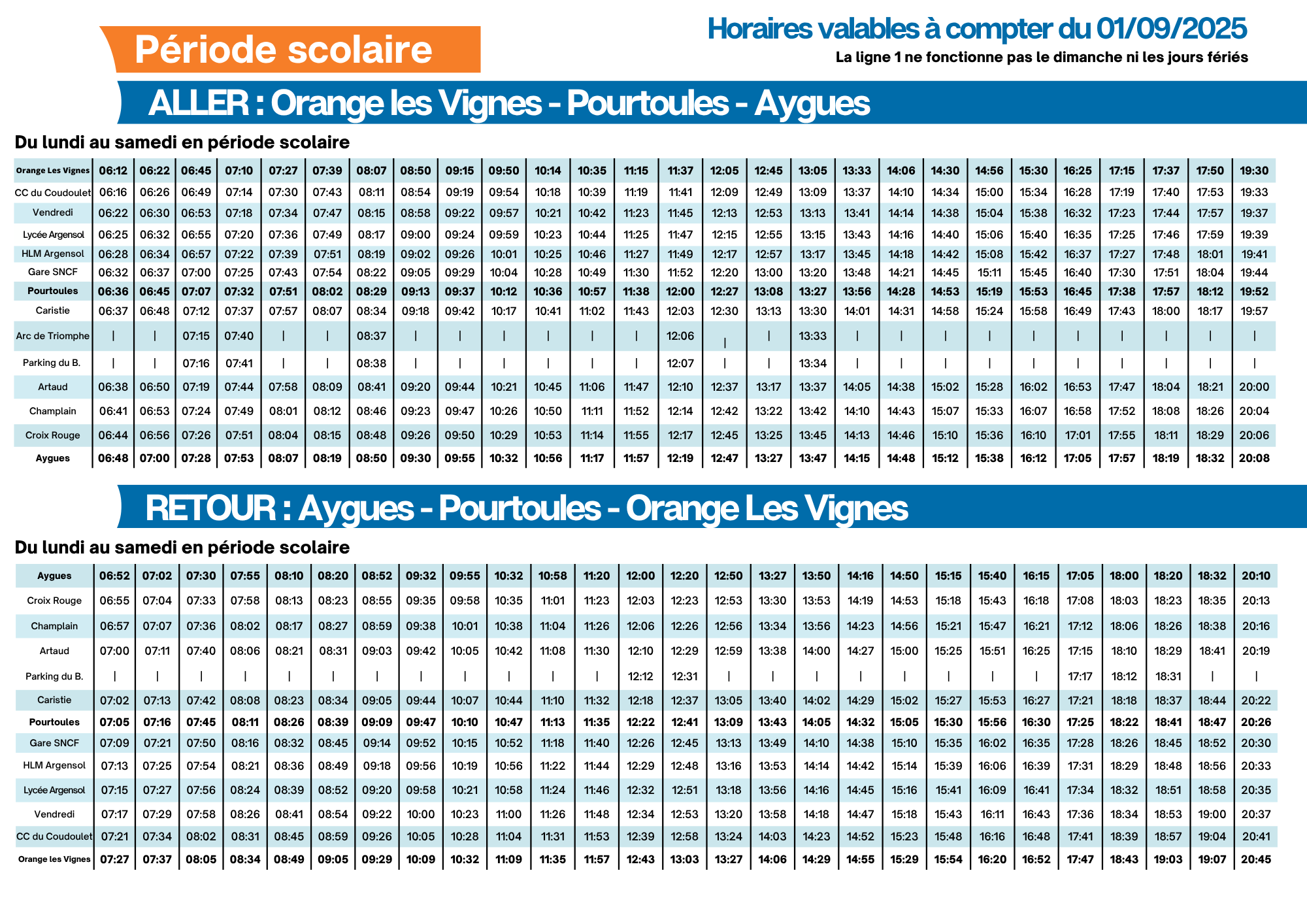 >>> Téléchargez la fiche horaire de la ligne 1 - période scolaire (à partir du 01 septembre 2025)
