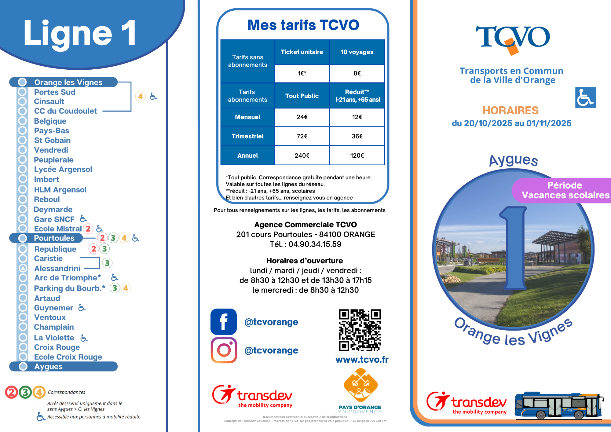 >>> Téléchargez la fiche horaire de la ligne 1 - vacances scolaires (du lundi 20 octobre au samedi 30 août 2025 inclus)