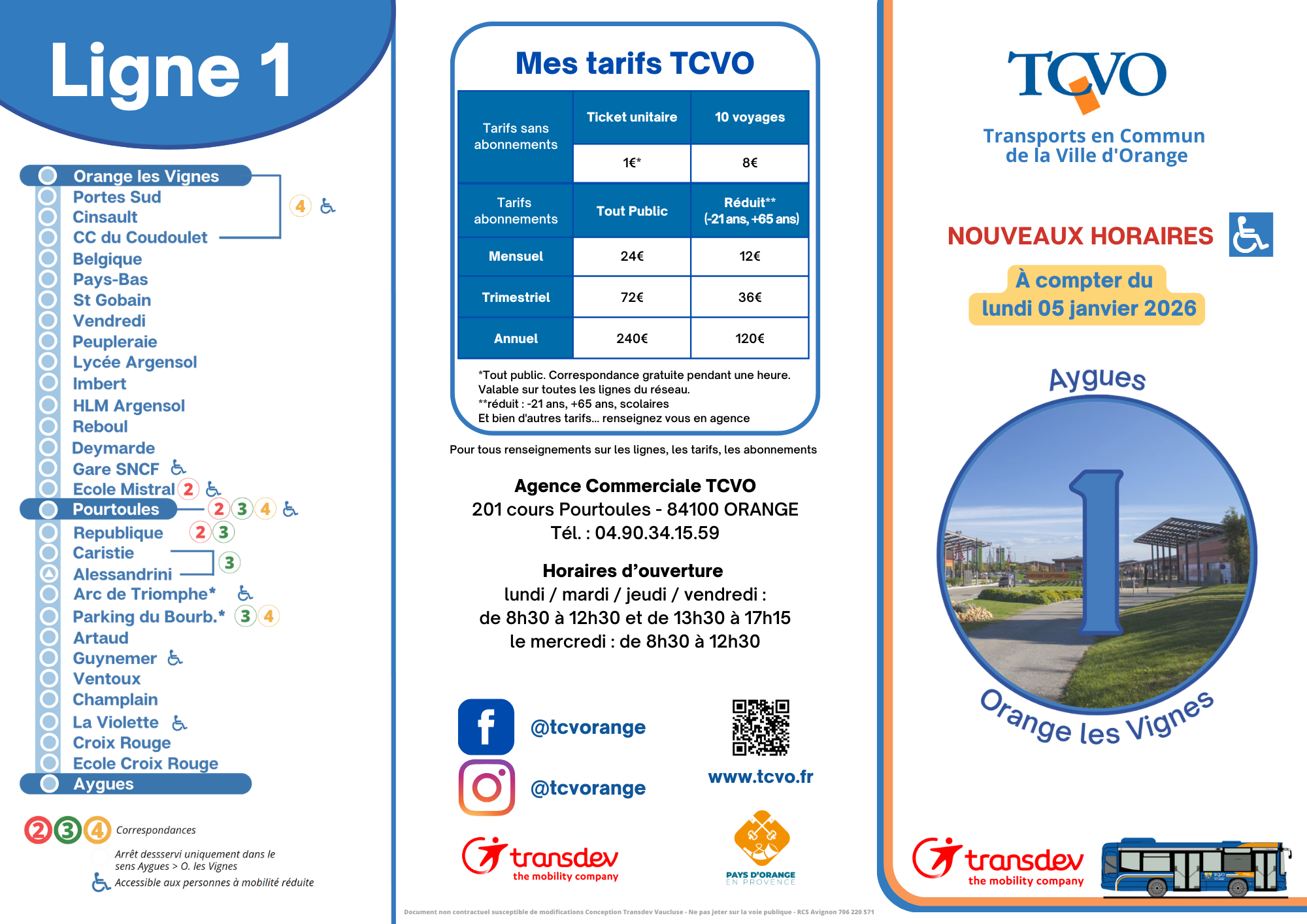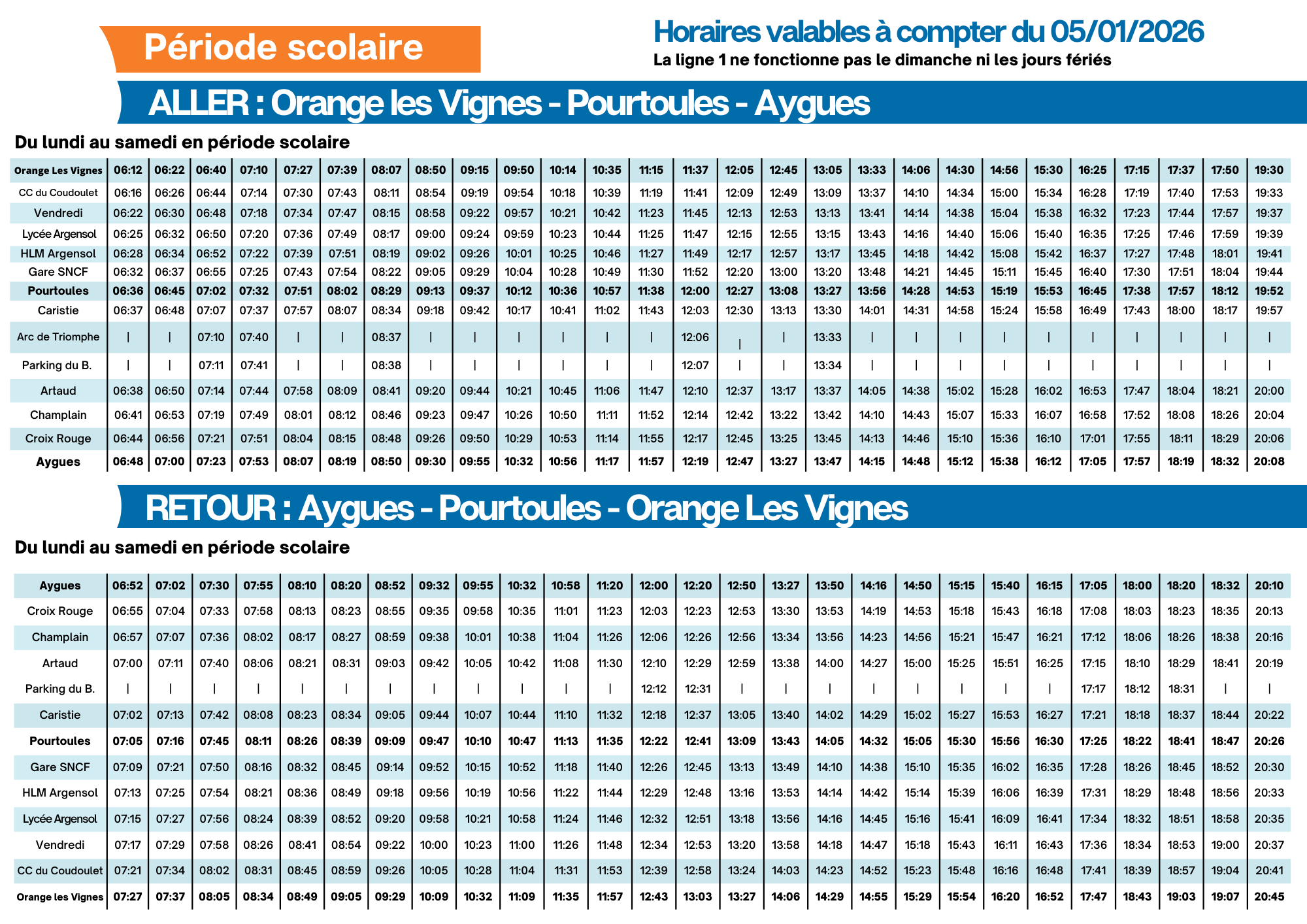 >>> Téléchargez la fiche horaire de la ligne 1 - période scolaire (à partir du 05 janvier 2026)