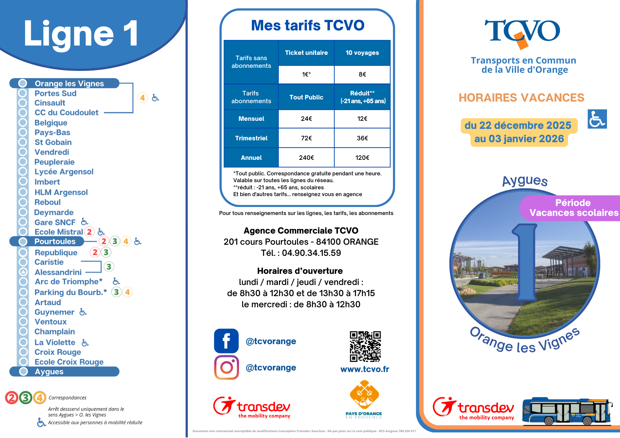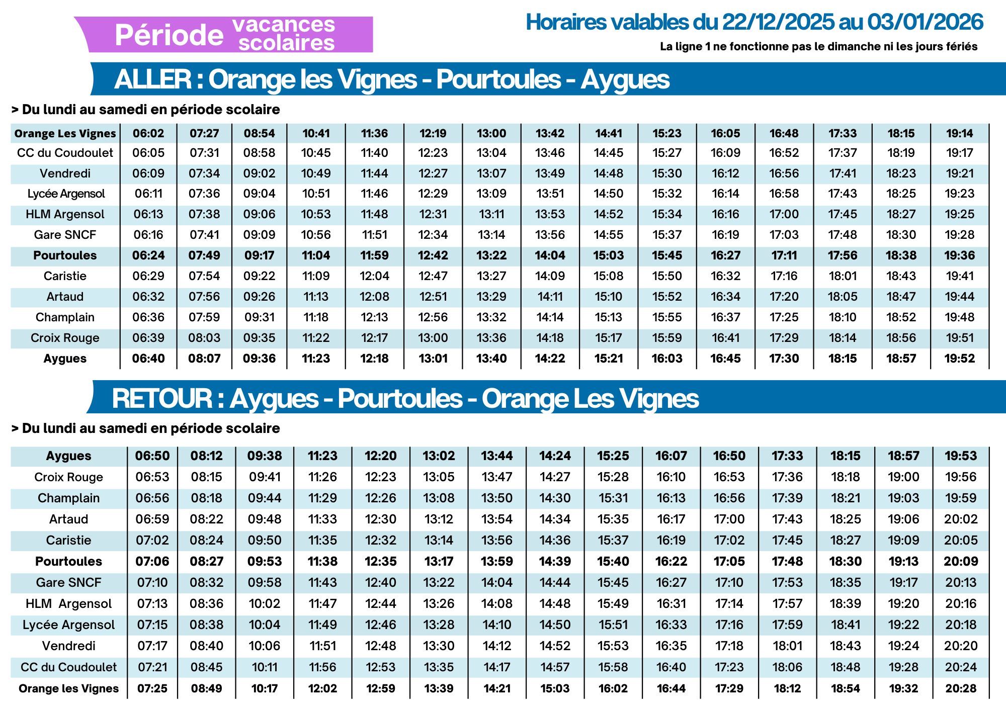 >>> Téléchargez la fiche horaire de la ligne 1 - vacances scolaires (du lundi 22 décembre 2025 au samedi 03 janvier 2026 inclus)
