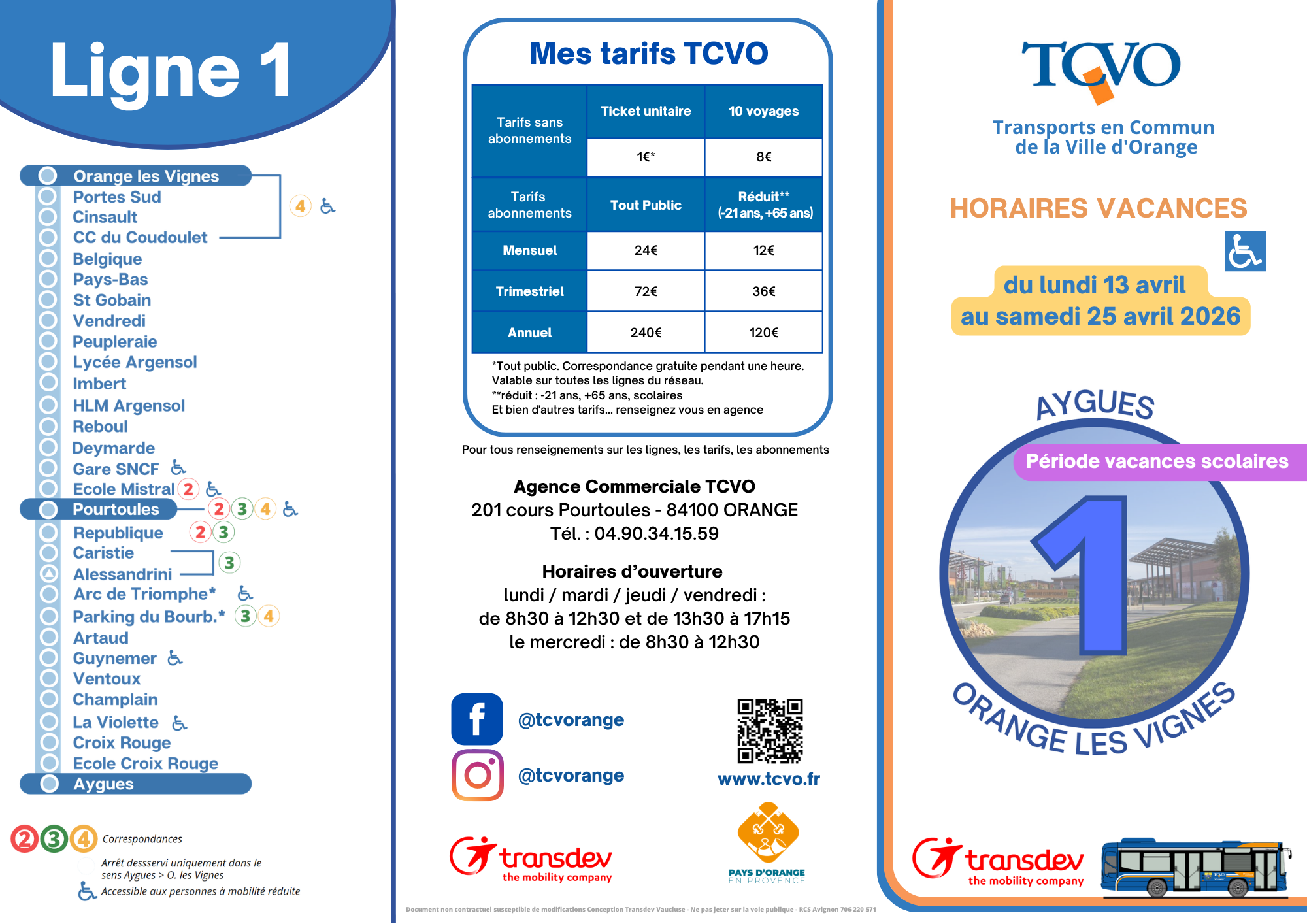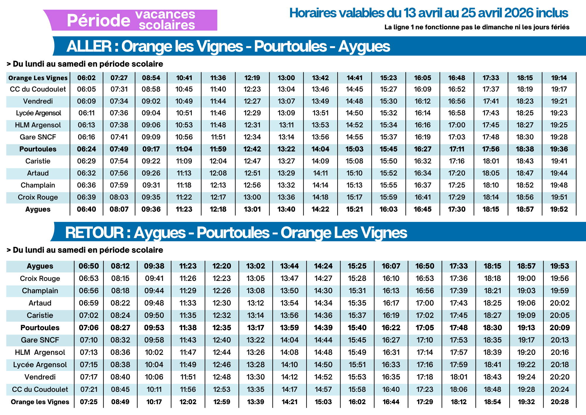 >>> Téléchargez la fiche horaire de la ligne 1 - vacances scolaires (du lundi 13 avril 2026 au samedi 25 avril 2026 inclus)